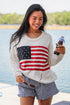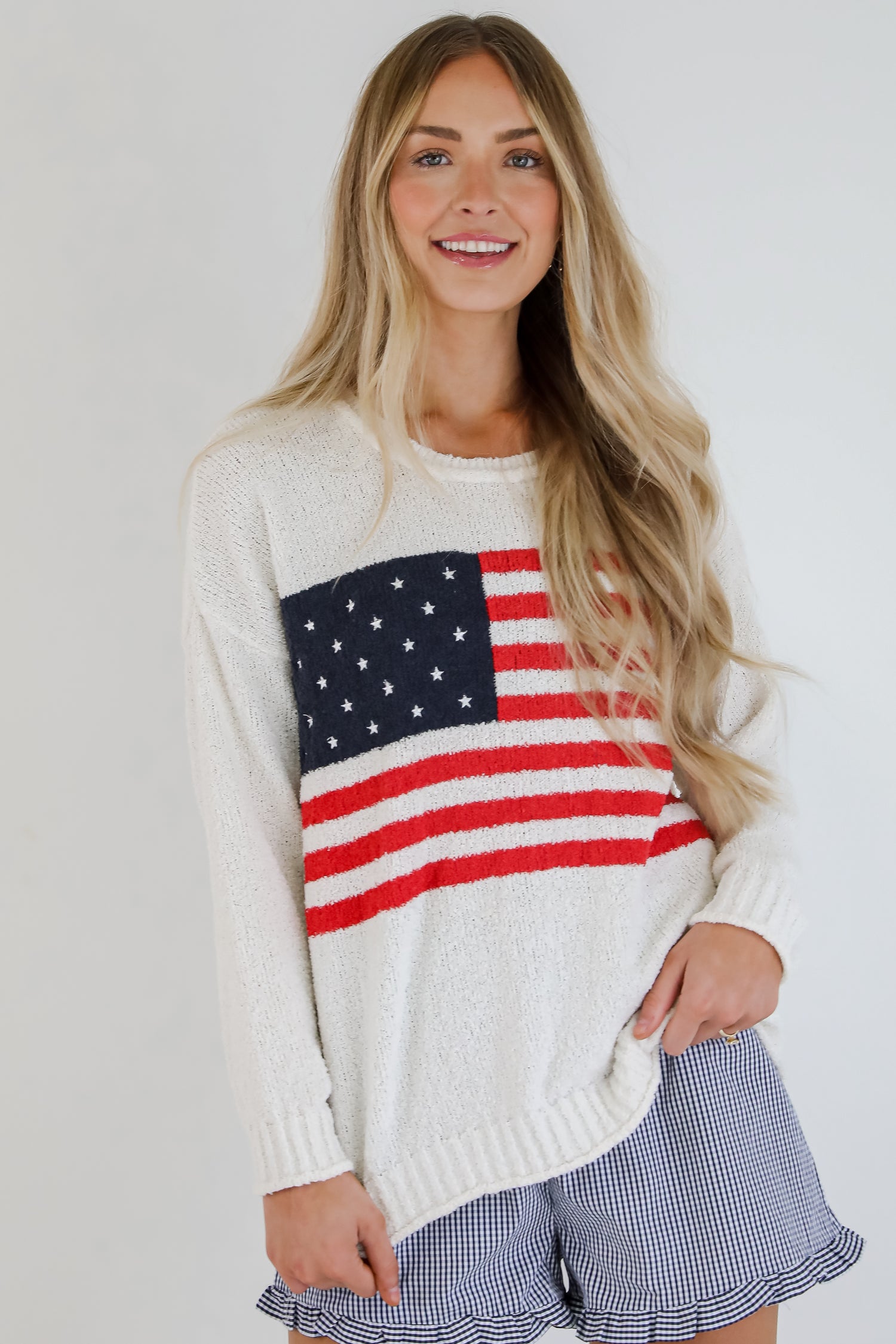 Classic Americana meets effortless comfort in the Ivory American Flag Lightweight Knit Top. This timeless piece features a soft, breathable knit in a creamy ivory hue, complete with a bold American flag graphic across the front for that iconic, all-American vibe. The relaxed fit and lightweight feel make it perfect for layering on breezy summer nights, Fourth of July festivities, or casual everyday wear. Pair it with denim cutoffs or white jeans for a look that's equal parts cozy and patriotic!
