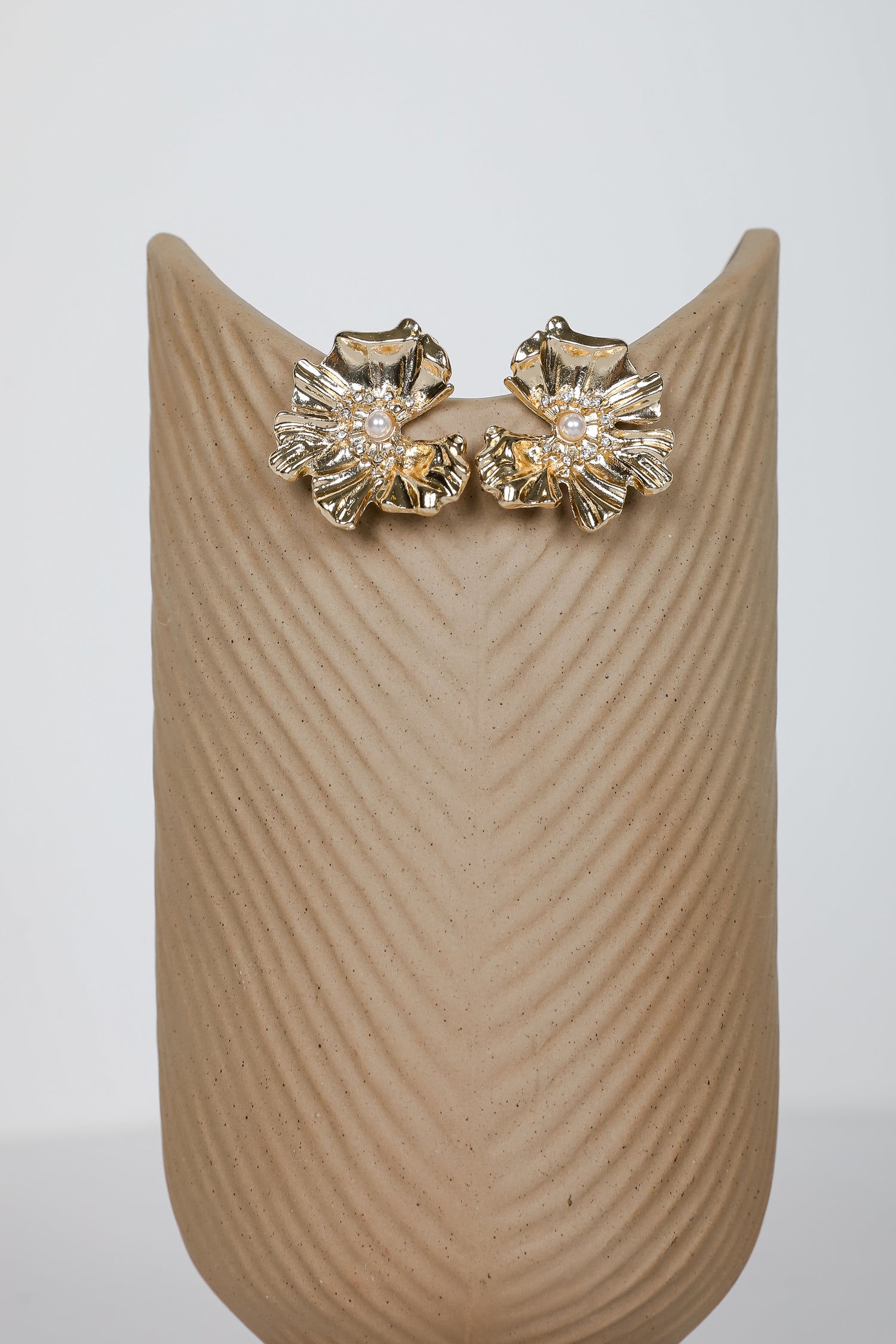 Coveted for their stunning presence, the Kaylee Gold Statement Earrings effortlessly adorn your face! These trendy gold earrings feature a textured abstract shape with rhinestones & pearls and a stud post back! Style the Kaylee Earrings with a mini dress + heels for a girly look!