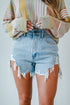 The Sloane Distressed Denim Shorts are cute, casual, and perfect for everyday day! These cute shorts are designed with a light wash denim. They feature a high-waisted fit, belt loops, a five-pocket cut, a button and hidden zipper fly, and distressing throughout with frayed hems. Pair the Sloane Shorts with all of your favorite tops!
