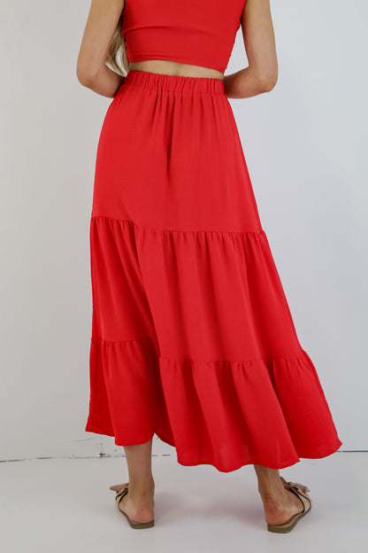 The Wave Of Liberty Red Tiered Maxi Skirt will have all your admirers obsessed with you! This stunning skirt features a vibrant red hue and a tiered silhouette that flows beautifully with every step. The lightweight fabric and elastic waistband ensure all-day comfort, while the maxi length adds an effortlessly elegant touch. Whether you're dressing it up with a blouse or keeping it casual with a tank and sandals, this skirt brings movement, color, and charm to any outfit!